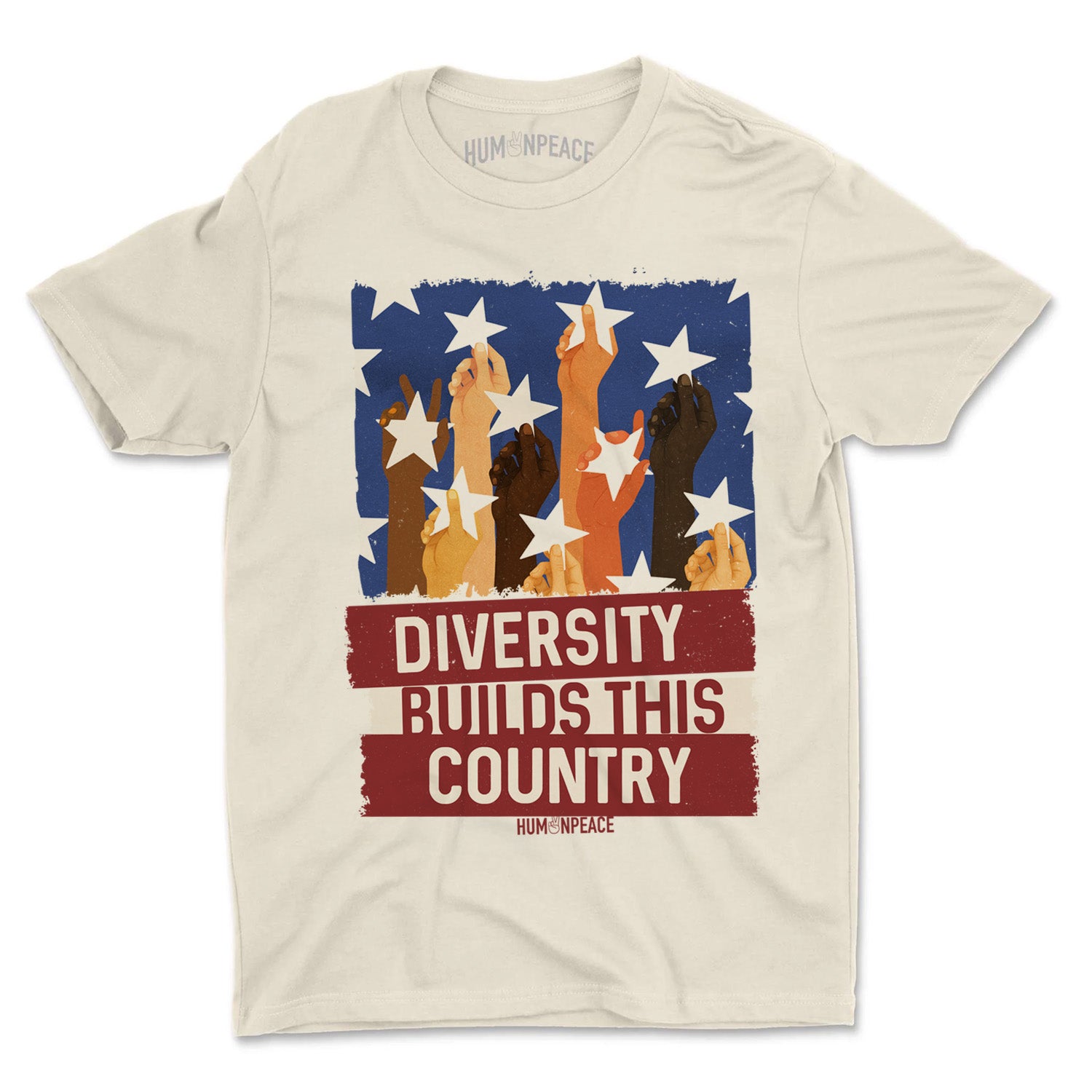 This design celebrates the strength that comes when people of every race and background stand together. Bold, raised fists break through the stars of the American flag, declaring proudly — Diversity Builds This Country.