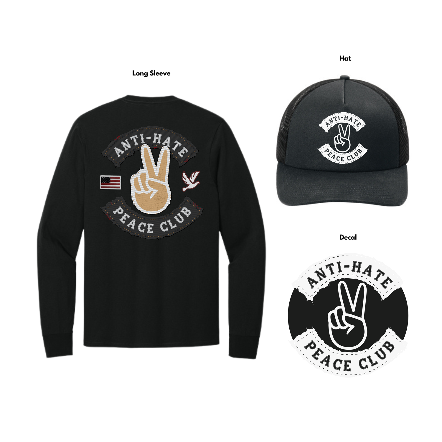 Spread a message of unity and kindness with the Anti Hate Peace Club Collection. This set includes a long sleeve, hat, and decal, all featuring the signature Anti Hate Peace Club design, so you can wear it, carry it, and display it proudly wherever you go.