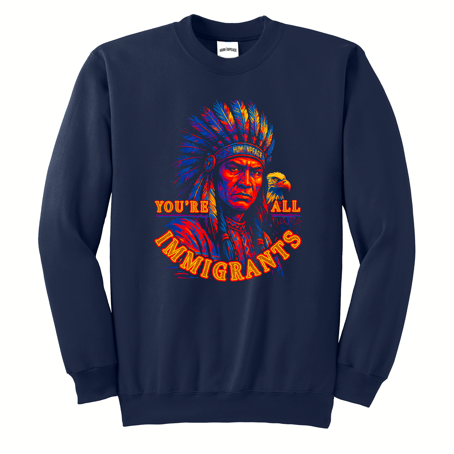 Our “You’re All Immigrants” sweatshirt that honors the true history beneath the surface. It challenges us to recognize our shared roots and respect the original stewards of this land.