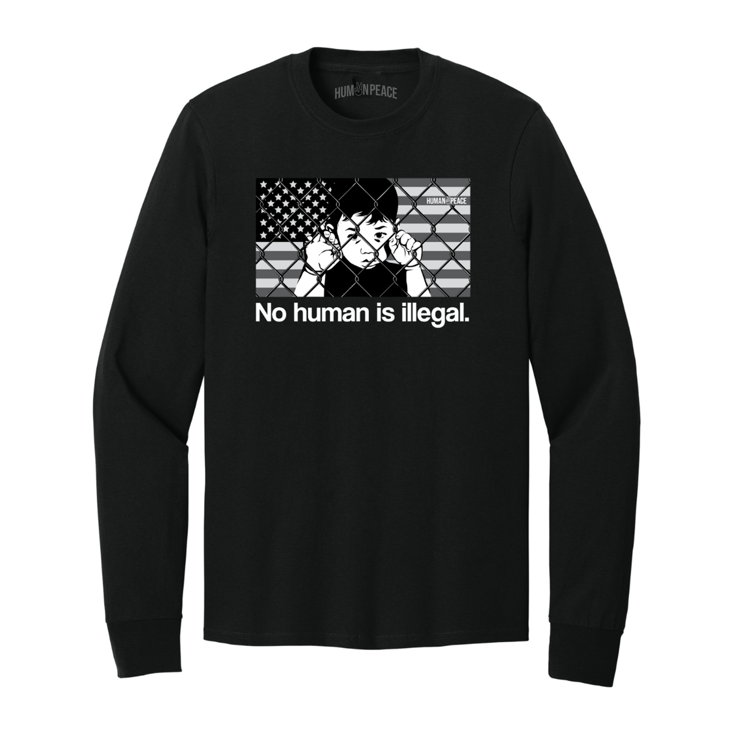 The "No Human Is Illegal" Long sleeve is a bold and emotional design that sheds light on the harsh realities of immigration policies. Featuring a black-and-white illustration of a child behind a chain-link fence, set against a grayscale American flag, this design speaks to the struggle, resilience, and hope of those seeking a better life. The powerful statement, "No Human Is Illegal," serves as a reminder that every person deserves dignity, compassion, and freedom.